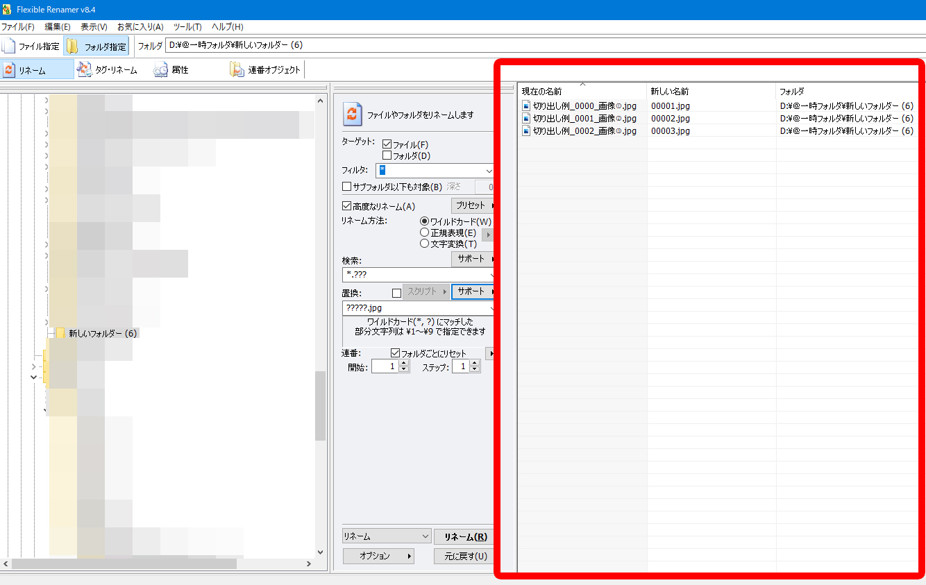 当方の設定では「?????」となっておりますがこれは00000~99999へリネームという意味で「???」に?の数を減らすと000~999にリネームとなります。